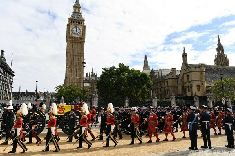 【9月19日 AFP】英首都ロンドンで19日、エリザベス女王(Queen Elizabeth II)の国葬が終了し、女王のひつぎが埋葬地となる同市郊外のウィンザー城(Windsor Castle)へ向け出発した。