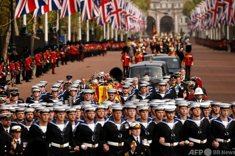 ひつぎの後にはチャールズ国王(King Charles III)をはじめとする英王族、英連邦(Commonwealth)加盟56か国の軍から派遣された部隊を含む行列が続いた。