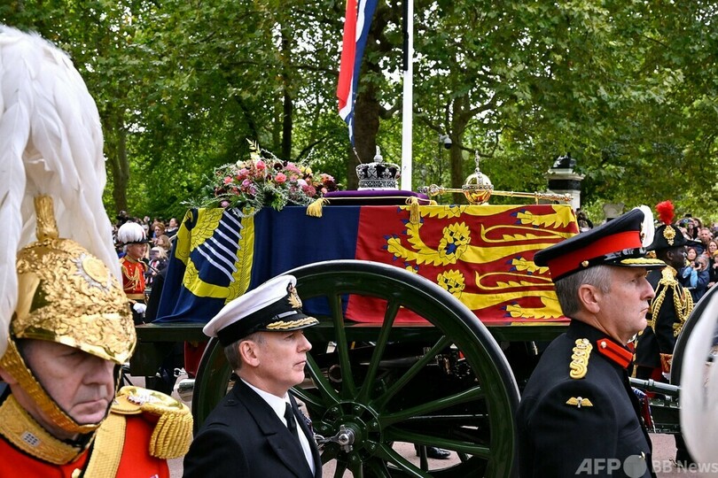 ひつぎの後にはチャールズ国王(King Charles III)をはじめとする英王族、英連邦(Commonwealth)加盟56か国の軍から派遣された部隊を含む行列が続いた。