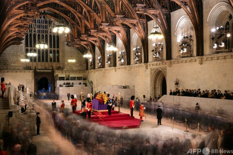 女王のひつぎは首都ロンドンにある国会議事堂のウェストミンスターホール(Westminster Hall)に、14日から19日朝まで安置された。一般弔問の待ち時間は、一時最長25時間に達した。