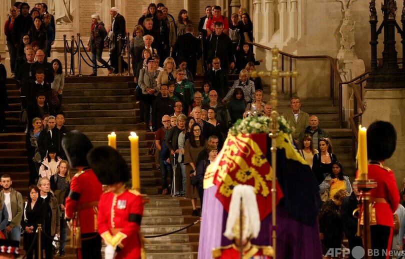 女王のひつぎは首都ロンドンにある国会議事堂のウェストミンスターホール(Westminster Hall)に、14日から19日朝まで安置された。一般弔問の待ち時間は、一時最長25時間に達した。