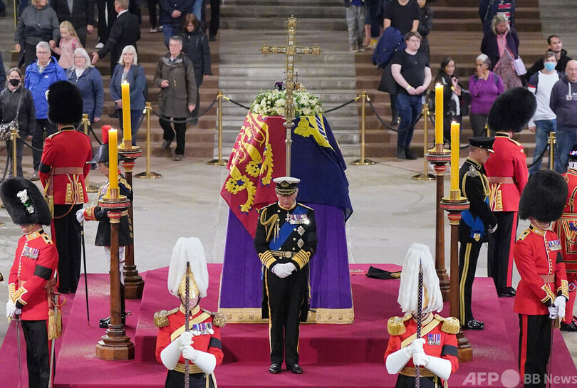 女王のひつぎは首都ロンドンにある国会議事堂のウェストミンスターホール(Westminster Hall)に、14日から19日朝まで安置された。一般弔問の待ち時間は、一時最長25時間に達した。