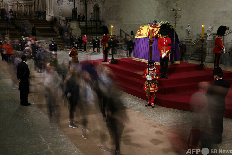 女王のひつぎは首都ロンドンにある国会議事堂のウェストミンスターホール(Westminster Hall)に、14日から19日朝まで安置された。一般弔問の待ち時間は、一時最長25時間に達した。