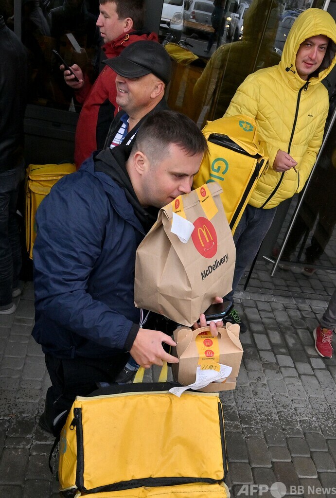 AFP取材班によると、キーウにあるマクドナルドの店舗前には、注文商品を受け取る配達員が列をつくっていた。