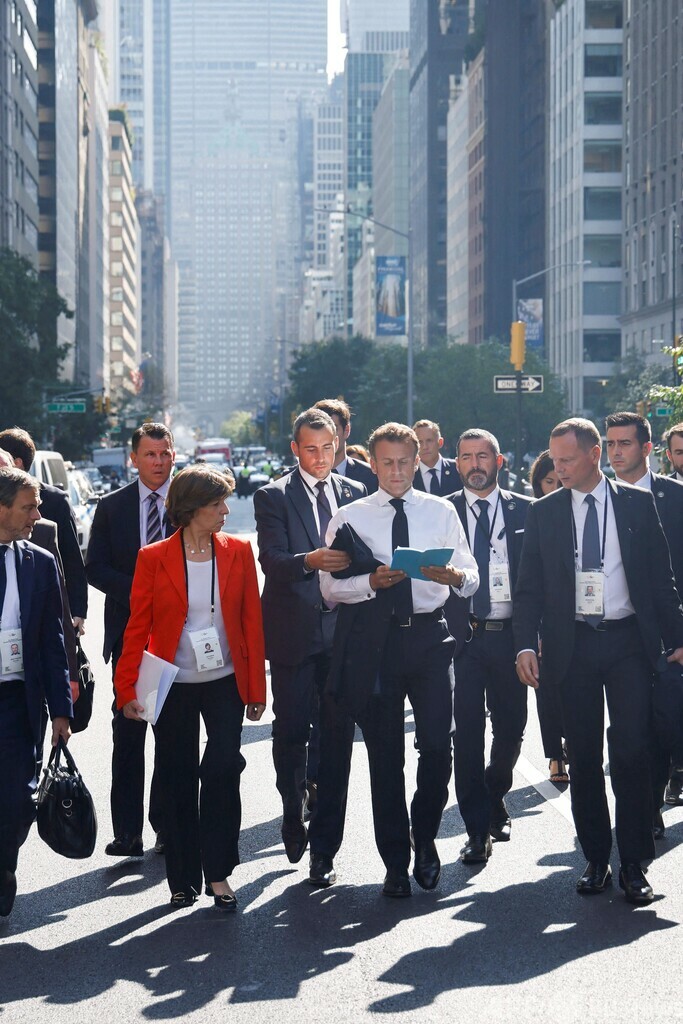 【9月22日 AFP】フランスのエマニュエル・マクロン(Emmanuel Macron)大統領が21日、米ニューヨークのパーク街(Park Avenue、オフィス街)をさっそうと歩く姿が見られた。