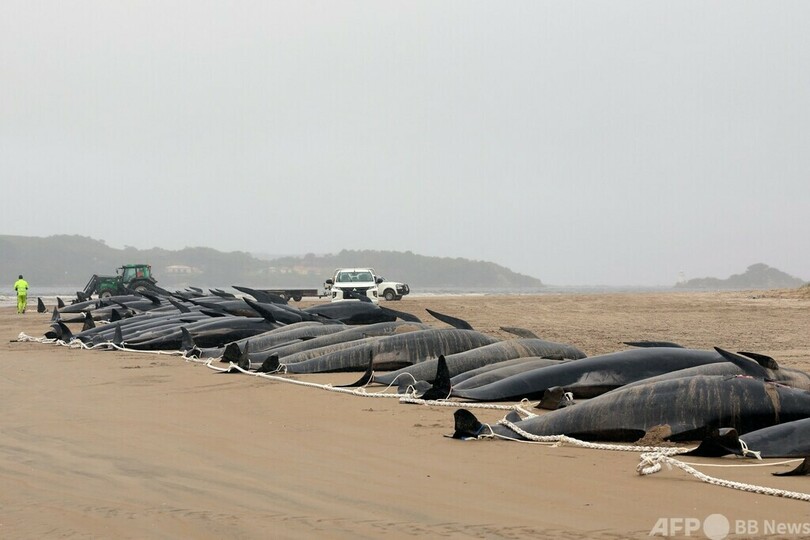 【9月23日 AFP】大量のゴンドウクジラが打ち上げられたオーストラリア・タスマニア(Tasmania)州西部では、23日も生き残ったクジラの救助活動が続けられた。今回の大量漂着では、すでに約200頭が死んでいる。