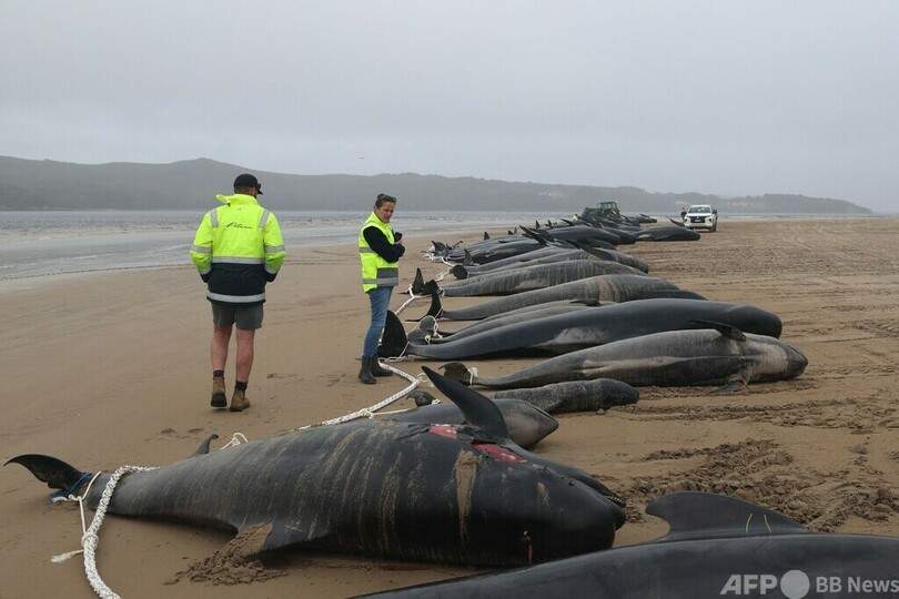 【9月23日 AFP】大量のゴンドウクジラが打ち上げられたオーストラリア・タスマニア(Tasmania)州西部では、23日も生き残ったクジラの救助活動が続けられた。今回の大量漂着では、すでに約200頭が死んでいる。