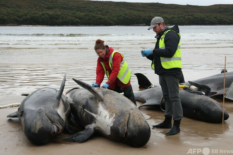 【9月23日 AFP】大量のゴンドウクジラが打ち上げられたオーストラリア・タスマニア(Tasmania)州西部では、23日も生き残ったクジラの救助活動が続けられた。今回の大量漂着では、すでに約200頭が死んでいる。