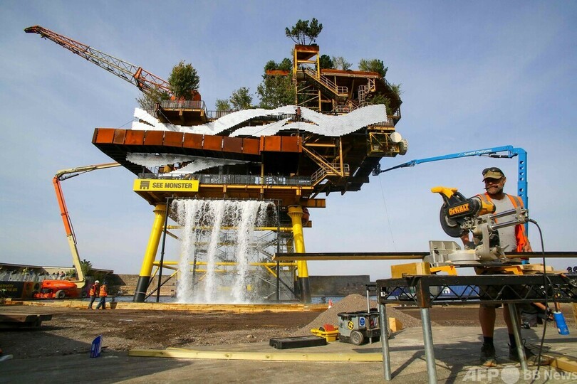 【10月4日 AFP】英ウェストンスーパーメア(Weston-super-Mare)にあるレジャー施設「トロピカーナ(Tropicana)」で公開されたパブリックアート作品「シーモンスター(See Monster)」のそばに立つ従業員。北海(North Sea)沖の油ガス田で使われていた洋上プラットフォームが撤去され、アートに生まれ変わった。(c)AFP