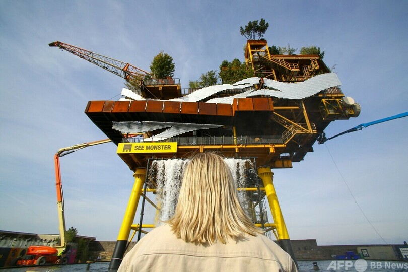 【10月4日 AFP】英ウェストンスーパーメア(Weston-super-Mare)にあるレジャー施設「トロピカーナ(Tropicana)」で公開されたパブリックアート作品「シーモンスター(See Monster)」のそばに立つ従業員。北海(North Sea)沖の油ガス田で使われていた洋上プラットフォームが撤去され、アートに生まれ変わった。(c)AFP