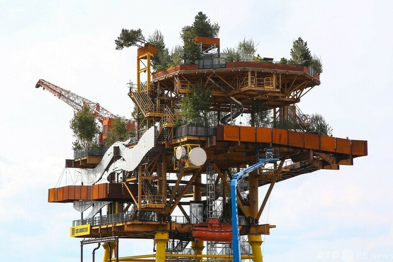 【10月4日 AFP】英ウェストンスーパーメア(Weston-super-Mare)にあるレジャー施設「トロピカーナ(Tropicana)」で公開されたパブリックアート作品「シーモンスター(See Monster)」のそばに立つ従業員。北海(North Sea)沖の油ガス田で使われていた洋上プラットフォームが撤去され、アートに生まれ変わった。(c)AFP