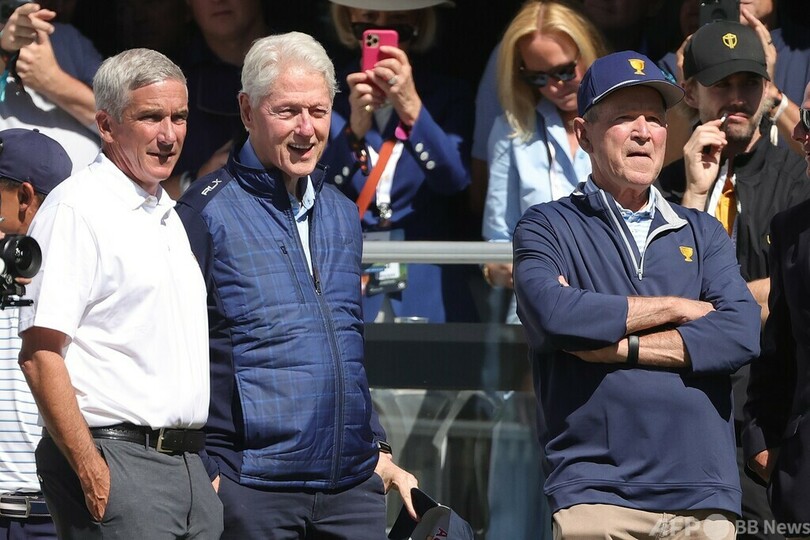 元米大統領のビル・クリントン(Bill Clinton)氏とジョージ・W・ブッシュ(George W. Bush)氏が観客4万人とともに声援を送っていた中、米国選抜は2日目の戦績を3勝2分けとし、ここまでのポイントで2017年大会に並ぶ大差をつけた。(c)AFP/Jim SLATER