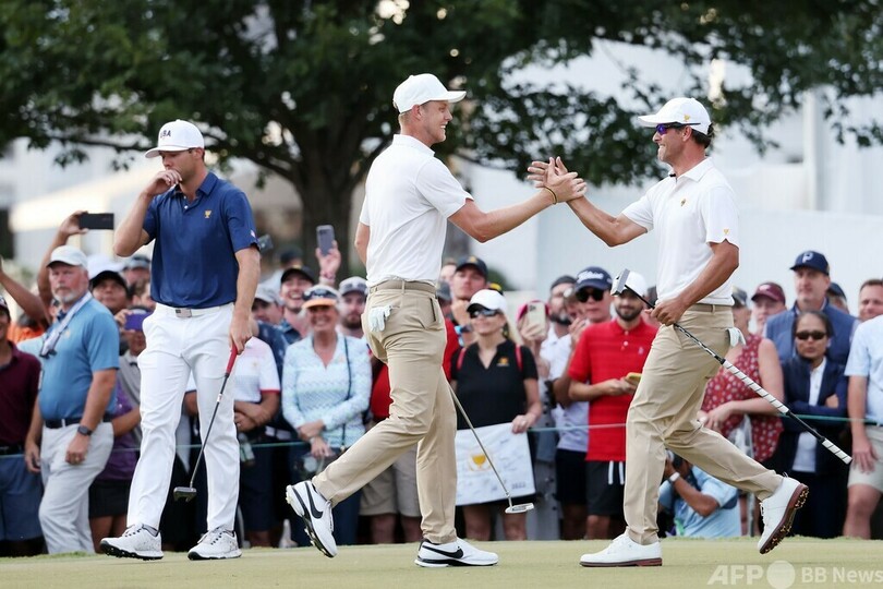 しかし世界選抜は、第3試合に勝利して迎えた4試合目でアダム・スコット(Adam Scott、オーストラリア)とペアを組んだデービスが16番で約3.4メートルのイーグルパット、17番で4.4メートルのバーディーパットを決めて初めてリードを奪うと、最後は18番でも2.7メートルのバーディーパットを入れてサム・バーンズ(Sam Burns)/ビリー・ホーシェル(Billy Horschel)組を1アップで下した。(c)AFP/Jim SLATER
