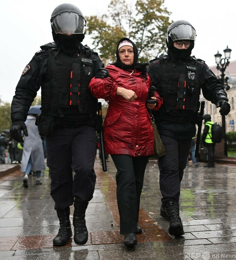 モスクワ中心部のチスチェイエ・プルドイ(Chistye Prudy)駅付近では、大勢の警官が配備される中、デモ参加者が1人で、または少人数のグループで歩き過ぎたり、黙って立ったりしていた。AFP記者は約20人が拘束されるのを目撃した。「私たちは大砲の餌食じゃない」と叫びながら連行される女性もいた。