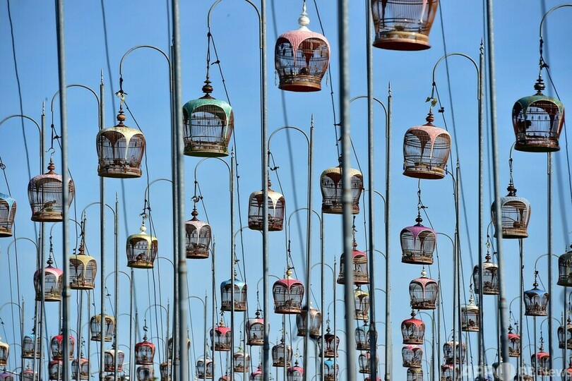 【10月2日 AFP】タイ南部ナラティワット(Narathiwat)県で行われた鳥の歌声コンテストで、会場に並べられた鳥の入った鳥籠。この毎年恒例のコンテストに、タイの他、マレーシア、シンガポールから約1500羽の鳥が出場した。(c)AFP