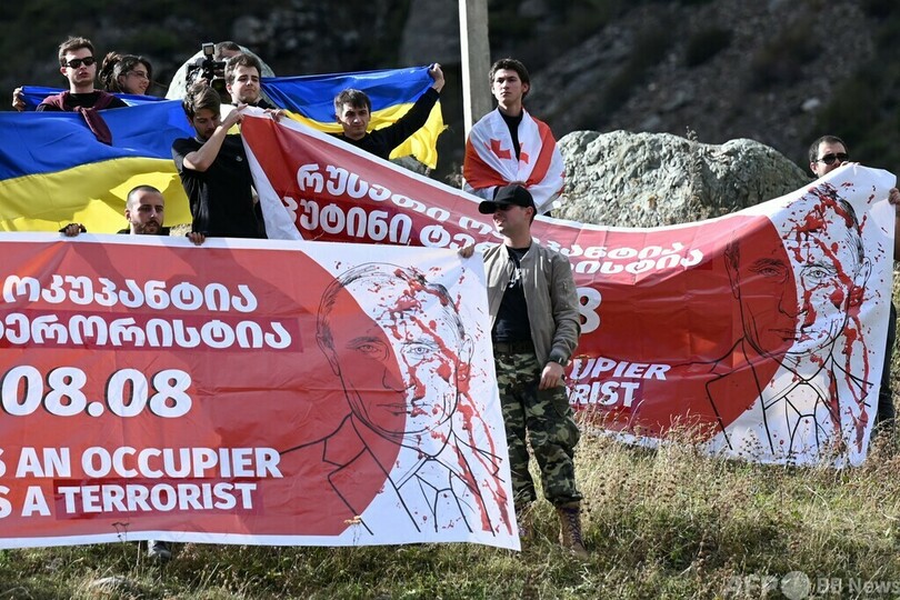 抗議集会は親欧米派の野党ドロアが主催。ロシア人が殺到している北部カズベク(Kazbegi)の国境検問所付近。数十人の参加者はジョージアとウクライナの国旗を振り、ウクライナの国歌や民謡を演奏。「プーチンはテロリスト」「ロシアは人殺し」などと書かれたプラカードを掲げた。