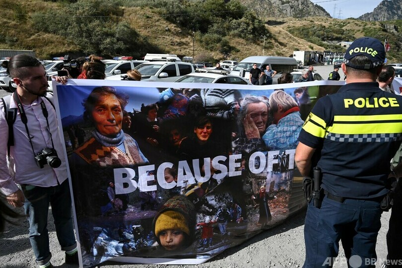 抗議集会は親欧米派の野党ドロアが主催。ロシア人が殺到している北部カズベク(Kazbegi)の国境検問所付近。数十人の参加者はジョージアとウクライナの国旗を振り、ウクライナの国歌や民謡を演奏。「プーチンはテロリスト」「ロシアは人殺し」などと書かれたプラカードを掲げた。