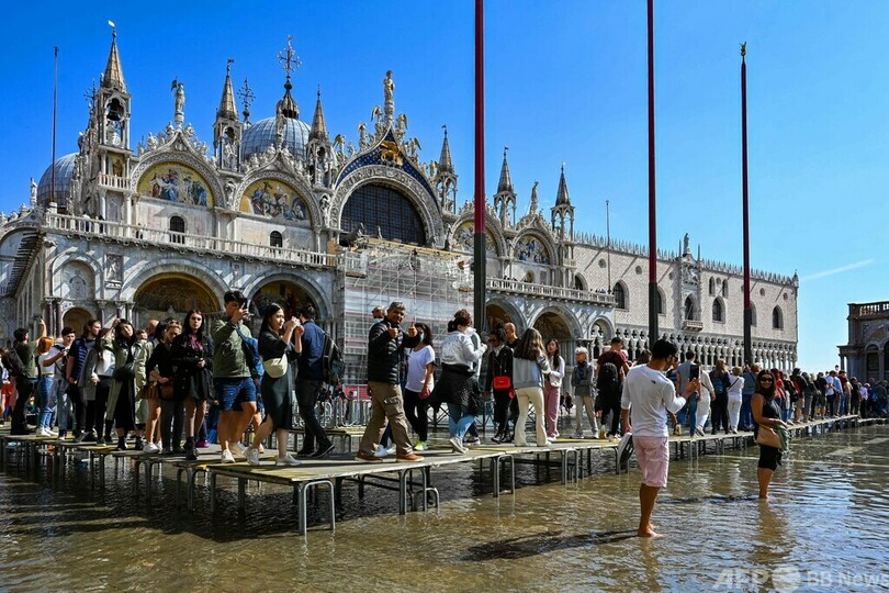 【10月1日 AFP】イタリア・ベネチア(Venice)のサンマルコ広場(St Mark's Square)が今週、「アクアアルタ」と呼ばれる高潮の影響で冠水した。