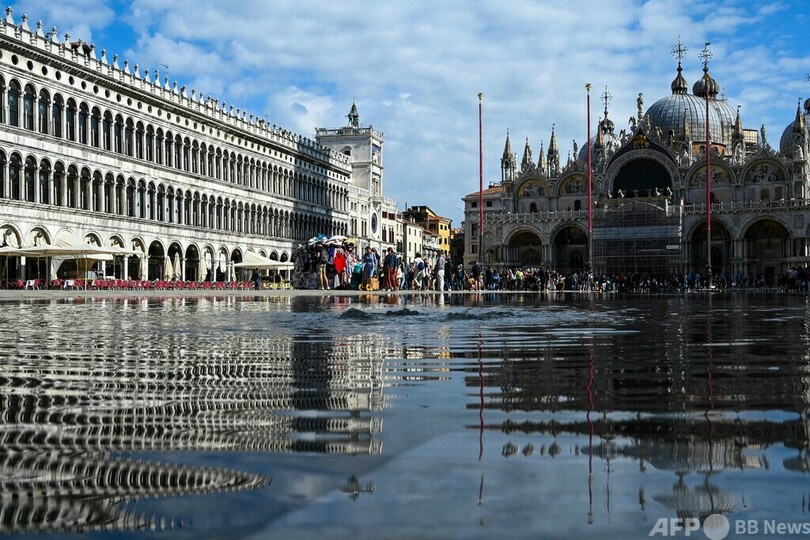 【10月1日 AFP】イタリア・ベネチア(Venice)のサンマルコ広場(St Mark's Square)が今週、「アクアアルタ」と呼ばれる高潮の影響で冠水した。