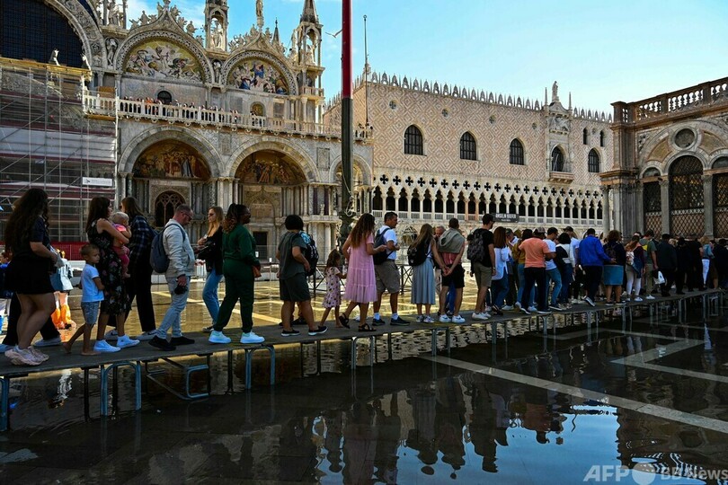 【10月1日 AFP】イタリア・ベネチア(Venice)のサンマルコ広場(St Mark's Square)が今週、「アクアアルタ」と呼ばれる高潮の影響で冠水した。