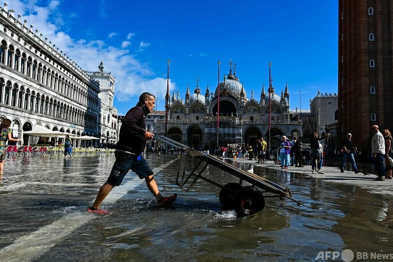 【10月1日 AFP】イタリア・ベネチア(Venice)のサンマルコ広場(St Mark's Square)が今週、「アクアアルタ」と呼ばれる高潮の影響で冠水した。