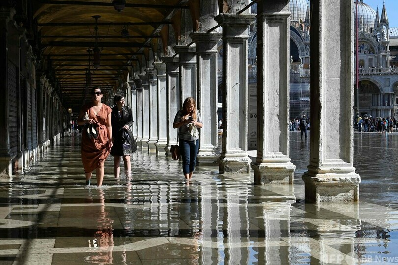 【10月1日 AFP】イタリア・ベネチア(Venice)のサンマルコ広場(St Mark's Square)が今週、「アクアアルタ」と呼ばれる高潮の影響で冠水した。