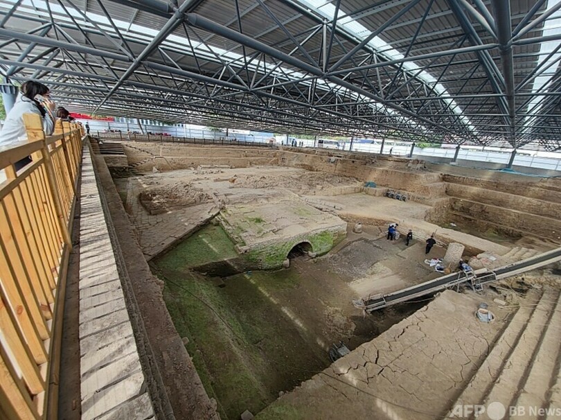 また、唐と宋の時代の汴河両岸の堤防、明の時代の州橋などが発見され、宋代の堤防には壁に霊獣と瑞雲模様の浮き彫りが施されていたことも判明しました。(c)CGTN Japanese/AFPBB News