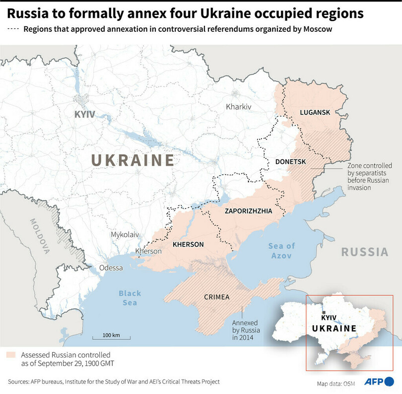 【9月30日 AFP】ロシア大統領府は30日、同国が併合を表明しているウクライナ4州のうち2州について、正確な境界線を明確にする必要があると述べた。ロシア軍は依然、この2州の完全支配に至っていない。