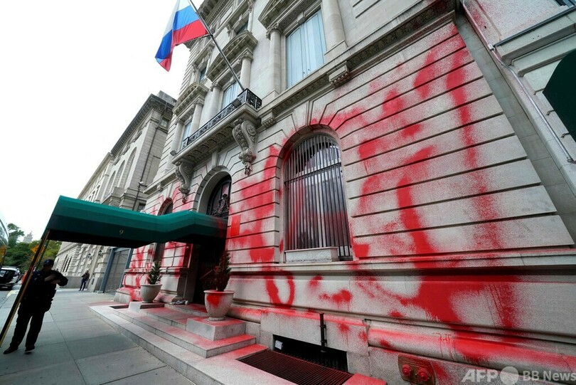 【10月1日 AFP】米ニューヨークで9月30日未明、ロシア領事館に赤い塗料がかけられているのが見つかった。ロシアのウラジーミル・プーチン(Vladimir Putin)大統領によるウクライナ侵攻への抗議とみられる。