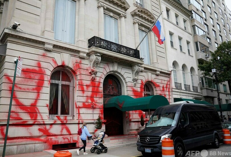 【10月1日 AFP】米ニューヨークで9月30日未明、ロシア領事館に赤い塗料がかけられているのが見つかった。ロシアのウラジーミル・プーチン(Vladimir Putin)大統領によるウクライナ侵攻への抗議とみられる。