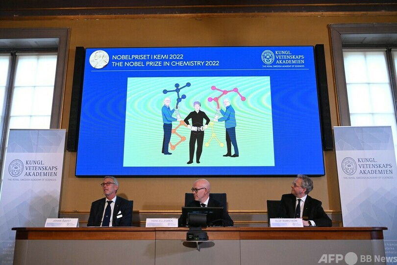 【10月5日 AFP】(更新、写真追加)スウェーデン王立科学アカデミー(Royal Swedish Academy of Sciences)は5日、2022年のノーベル化学賞(Nobel Prize in Chemistry)を、「クリックケミストリー」と呼ばれる分野における功績など、より実用的な化学の基礎を築いたとして、米国のキャロライン・ベルトッツィ(Carolyn Bertozzi)、バリー・シャープレス(Barry Sharpless)両氏と、デンマークのモーテン・メルダル(Morten Meldal)氏に授与すると発表した。