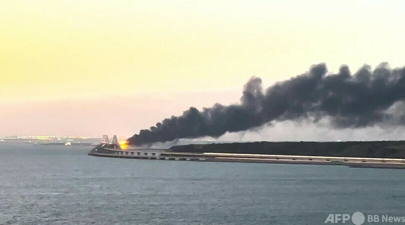 橋はロシアのクリミア併合を象徴する存在で、同国にとって非常に重要な輸送路。ソーシャルメディアに投稿された映像によると、爆発により橋は炎上し、一部が海に崩落した。