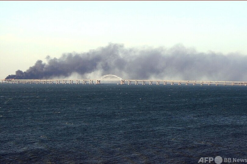 橋はロシアのクリミア併合を象徴する存在で、同国にとって非常に重要な輸送路。ソーシャルメディアに投稿された映像によると、爆発により橋は炎上し、一部が海に崩落した。