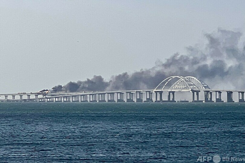 橋はロシアのクリミア併合を象徴する存在で、同国にとって非常に重要な輸送路。ソーシャルメディアに投稿された映像によると、爆発により橋は炎上し、一部が海に崩落した。