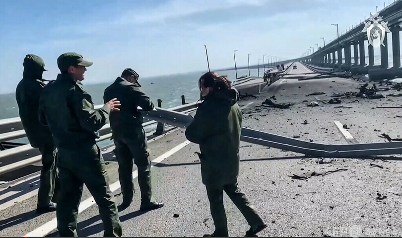 ウクライナのミハイロ・ポドリャク(Mykhailo Podolyak)大統領府顧問はツイッター(Twitter)に、橋の崩落部分の写真を投稿し、「クリミア、橋、始まり。違法なものはすべて破壊されなければならない。盗まれたものはすべてウクライナに返還されなければならない」とコメントした。(c)AFP