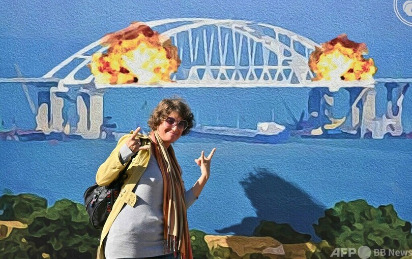 【10月10日 AFP】ウクライナ南部クリミア(Crimea)半島とロシア本土を結ぶクリミア橋で8日、爆発が起きたのを受け、ウクライナの首都キーウ中心部に同日、早くも爆発をモチーフにした切手の大型パネルが登場し、写真撮影する人々の姿が見られた。