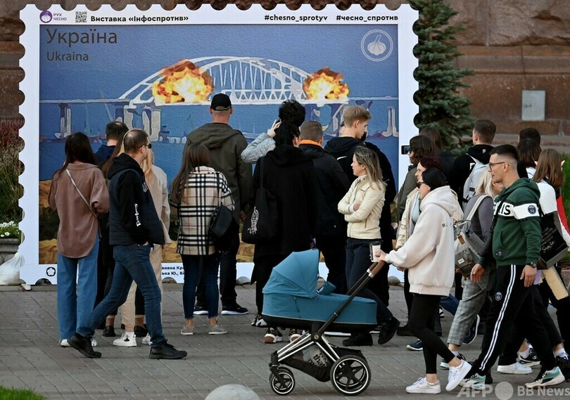 【10月10日 AFP】ウクライナ南部クリミア(Crimea)半島とロシア本土を結ぶクリミア橋で8日、爆発が起きたのを受け、ウクライナの首都キーウ中心部に同日、早くも爆発をモチーフにした切手の大型パネルが登場し、写真撮影する人々の姿が見られた。