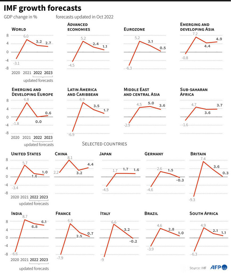 各国では、ロシアによるウクライナ侵攻の影響により生活費が高騰し、景気が悪化している。IMFは、来年の世界の経済成長率見通しを7月の前回予測から0.2ポイント引き下げ、2.7%とした。一方、今年の成長率見通しは3.2%に据え置いた。