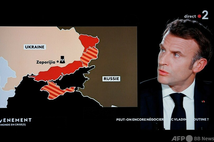マクロン氏は国営テレビのフランス2(France 2)で「今はまず、ウラジーミル・プーチン氏がこの戦争をやめ、ウクライナの領土保全を尊重し、交渉の席に戻るべきだ」と強調。「世界規模の戦争」は回避したいと述べた。