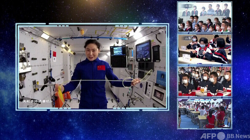 今回のイベントでは、地上メイン教室が中国科学院宇宙応用プロジェクト・技術センターに、地上サブ教室が中国東部の山東省荷沢市、中部の河南省鄭州市、南西部の雲南省大理市の3カ所に設置され、小中学生の代表約400人がライブイベントに参加しました。この模様は、中央広播電視総台(チャイナ・メディア・グループ、CMG)の各プラットフォームで生中継されました。(c)CGTN Japanese/AFPBB News