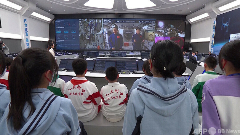 今回のイベントでは、地上メイン教室が中国科学院宇宙応用プロジェクト・技術センターに、地上サブ教室が中国東部の山東省荷沢市、中部の河南省鄭州市、南西部の雲南省大理市の3カ所に設置され、小中学生の代表約400人がライブイベントに参加しました。この模様は、中央広播電視総台(チャイナ・メディア・グループ、CMG)の各プラットフォームで生中継されました。(c)CGTN Japanese/AFPBB News