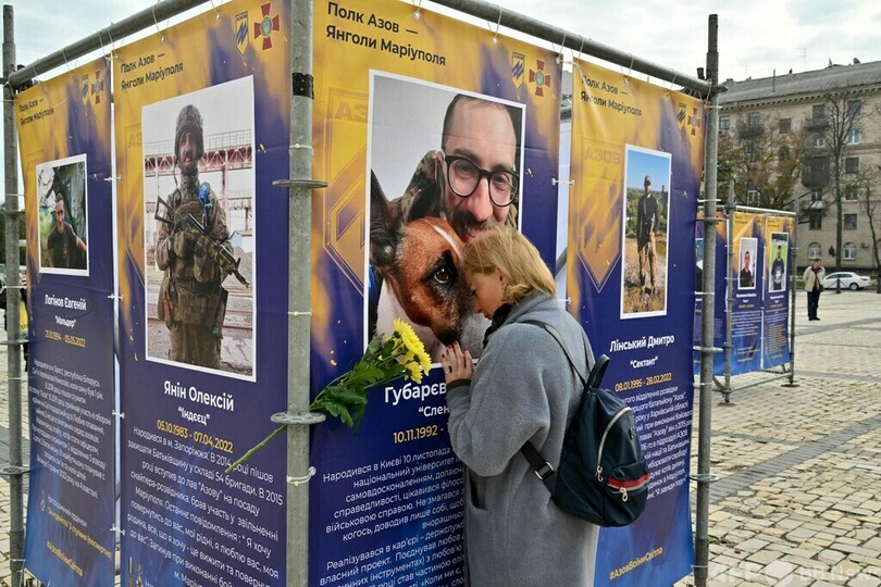 【10月15日 AFP】ウクライナは14日、ロシアによる侵攻後初めて「ウクライナ防衛者の日」を迎えた。首都キーウ中心部では野外展「アゾフ連隊─マリウポリの天使たち(Azov Regiment - Angels of Mariupol)」が開幕し、展示されている戦死者の遺影の前で涙を流す親族の姿も見られた。
