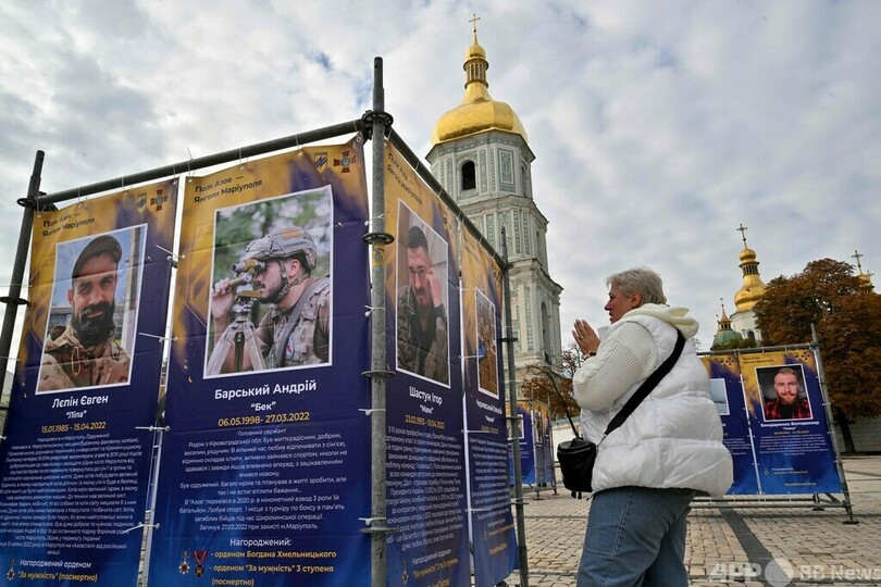 【10月15日 AFP】ウクライナは14日、ロシアによる侵攻後初めて「ウクライナ防衛者の日」を迎えた。首都キーウ中心部では野外展「アゾフ連隊─マリウポリの天使たち(Azov Regiment - Angels of Mariupol)」が開幕し、展示されている戦死者の遺影の前で涙を流す親族の姿も見られた。