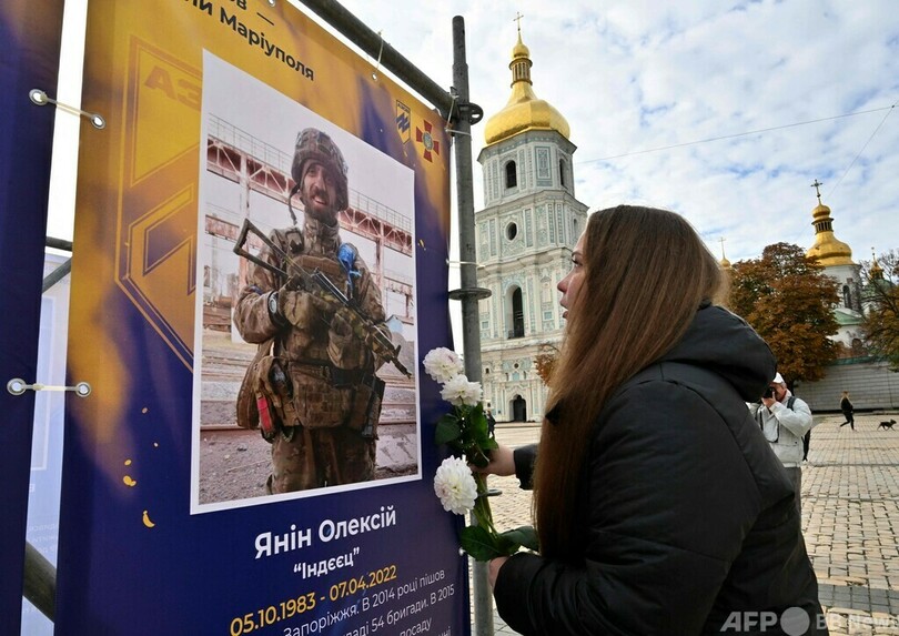【10月15日 AFP】ウクライナは14日、ロシアによる侵攻後初めて「ウクライナ防衛者の日」を迎えた。首都キーウ中心部では野外展「アゾフ連隊─マリウポリの天使たち(Azov Regiment - Angels of Mariupol)」が開幕し、展示されている戦死者の遺影の前で涙を流す親族の姿も見られた。