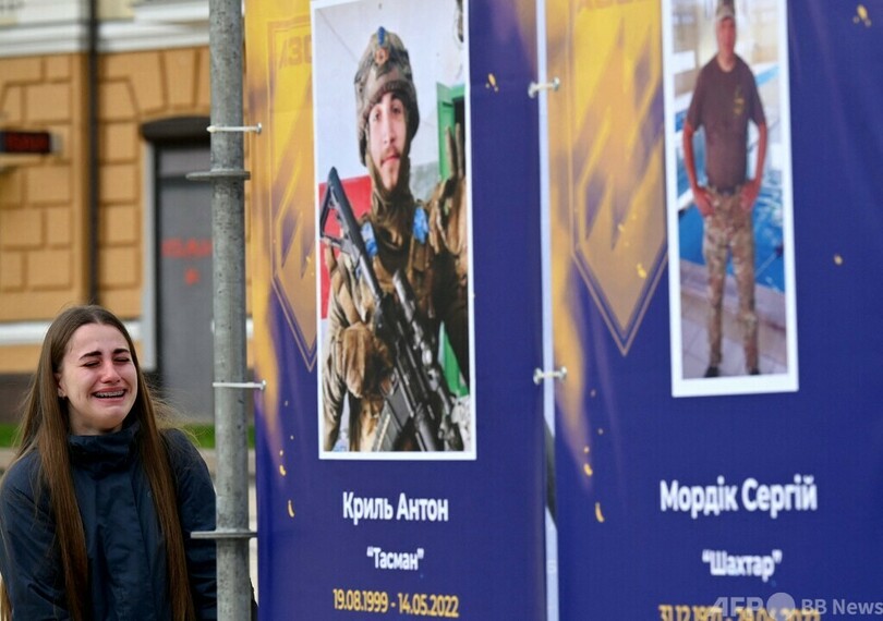 【10月15日 AFP】ウクライナは14日、ロシアによる侵攻後初めて「ウクライナ防衛者の日」を迎えた。首都キーウ中心部では野外展「アゾフ連隊─マリウポリの天使たち(Azov Regiment - Angels of Mariupol)」が開幕し、展示されている戦死者の遺影の前で涙を流す親族の姿も見られた。