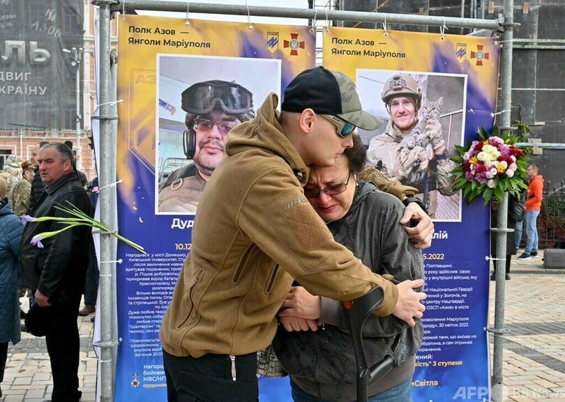 【10月15日 AFP】ウクライナは14日、ロシアによる侵攻後初めて「ウクライナ防衛者の日」を迎えた。首都キーウ中心部では野外展「アゾフ連隊─マリウポリの天使たち(Azov Regiment - Angels of Mariupol)」が開幕し、展示されている戦死者の遺影の前で涙を流す親族の姿も見られた。