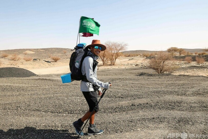 AFPが取材した9月下旬、アルスルミさんはサウジアラビアの首都リヤドから南西に340キロ離れたカスラー(Al-Khasrah)という町にいた。背中のリュックにはサウジアラビアとカタールの国旗を立てていた。
