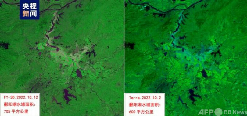 FY3D衛星の観測によりますと、鄱陽湖と付近の水域の面積は705平方キロメートルで、例年同時期の2285平方キロメートルに比べて7割近く縮小していますが、今年最小となった10月2日時点の600平方キロメートルと比べると105平方キロメートル拡大しています。8月24日、9月5日、同19日、同27日、10月2日の観測で相次いで最小記録を更新していましたが、拡大に転じました。(c)CGTN Japanese/AFPBB News