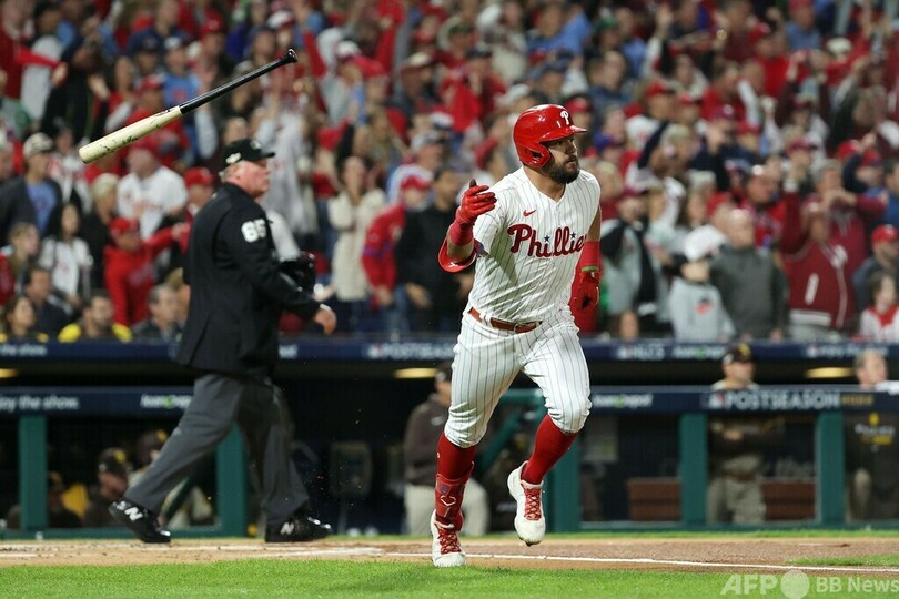 【10月22日 AFP】22MLBは21日、ナ・リーグ優勝決定シリーズ(7回戦制)第3戦が行われ、フィラデルフィア・フィリーズ(Philadelphia Phillies)はカイル・シュワバー(Kyle Schwarber)がまたしても一発を放つなどしてサンディエゴ・パドレス(San Diego Padres)を4-2で下し、2勝1敗とリードした。