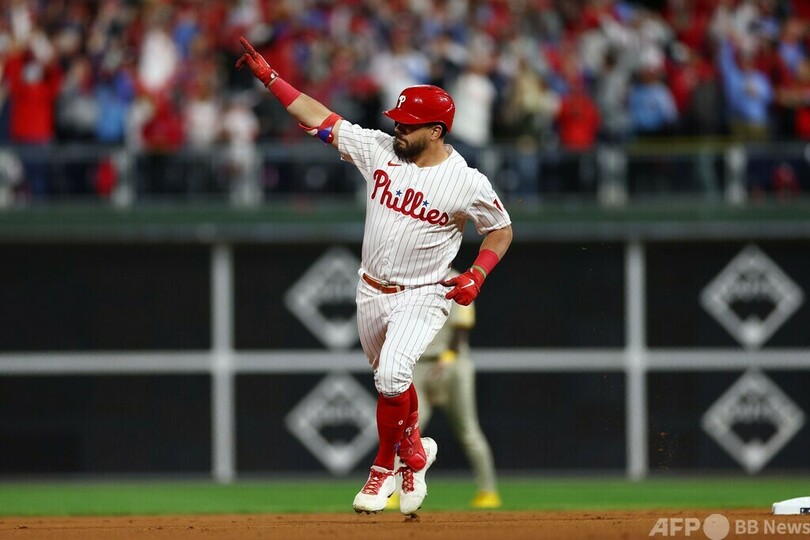 【10月22日 AFP】22MLBは21日、ナ・リーグ優勝決定シリーズ(7回戦制)第3戦が行われ、フィラデルフィア・フィリーズ(Philadelphia Phillies)はカイル・シュワバー(Kyle Schwarber)がまたしても一発を放つなどしてサンディエゴ・パドレス(San Diego Padres)を4-2で下し、2勝1敗とリードした。